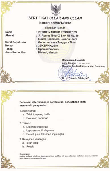 Sertifikat Clear and Clean PT. SMR Untuk Sertifikat Clear and Clean PT. SMR bisa dilihat pada tautan di bawah ini: